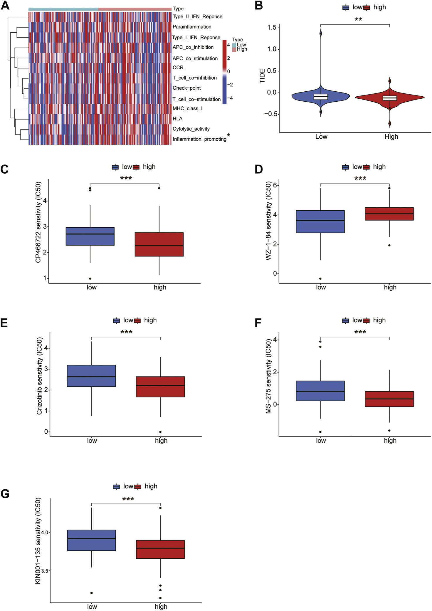 Immune-related function analysis and drug sensitivity. (A) Immune-related function analysis of CRLs. (B) Tumor immune dysfunction and exclusion (TIDE) algorithm analysis for high-risk and low-risk groups. Drug sensitivity of CP-466722, crizotinib, MS-275, KIN001-135, CP-466722 (C–G).