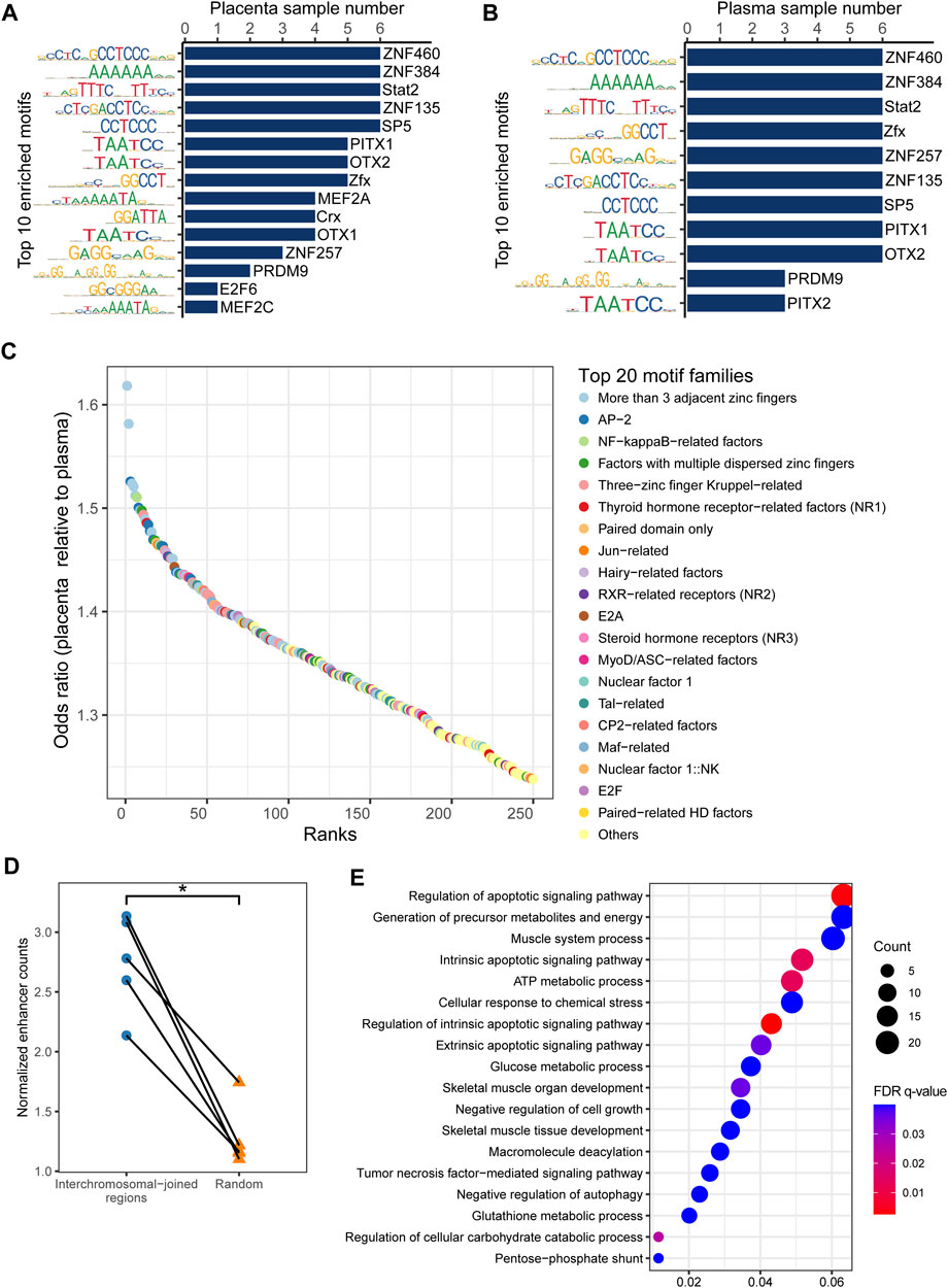 FIGURE 3. Enriched transcription factor binding motifs for eccDNA flanking regions. Top 10 motifs in (A) placenta and (B) maternal plasma. (C) Top 20 significantly enriched transcription factor families in placental eccDNA relative to plasma eccDNA. (D) Normalized enhancer counts for confident multi-chromosomal joined regions and randomly generated regions. One-tailed Wilcoxon signed-rank test, p = 0.031. (E) GO terms enriched in multi-chromosomal-fragment eccDNA–associated genes. *p < 0.05.