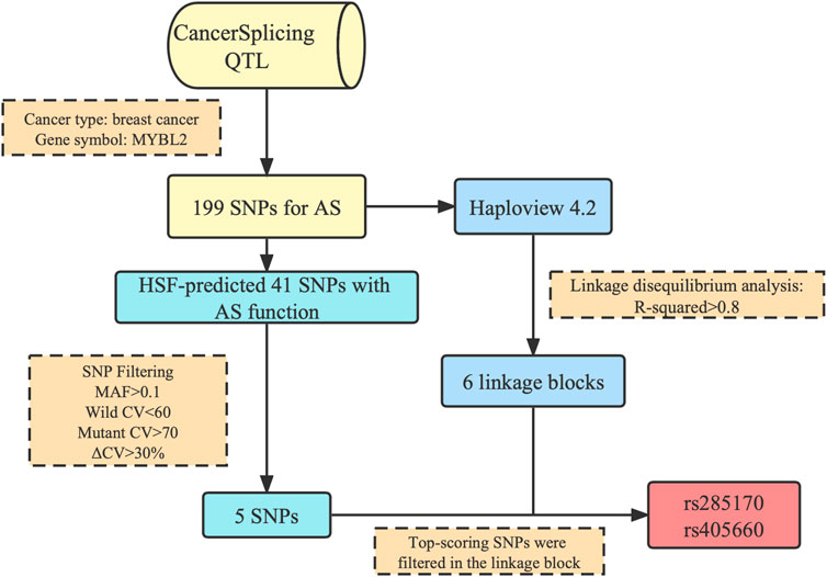 FIGURE 1. Flowchart of MYBL2 alternative splicing-related SNP screening. 199 MYBL2 AS-related genetic variants were acquired at CancerSplicingQTL. Five SNPs with potential functions in alternative splicing were further screened out in HSF. Six linkage blocks were simultaneously obtained by Haploview. Two SNPs, rs285170 and rs405660, were finally included in the follow-up study.