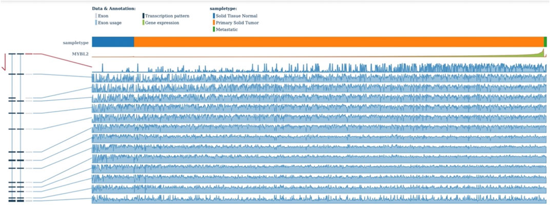 We used the CancerSplicingQTL database to analyse candidate sites, the exon in which they were predicted to act, the splicing pattern, and the splice site, to determine what spliceosome the candidate site might affect. The expression differences in MYBL2 splice isoforms among different tissues were analysed using the TSVdb platform (http://tsvdb.com/index.html) to determine whether the splice isoforms are associated with breast cancer risk.