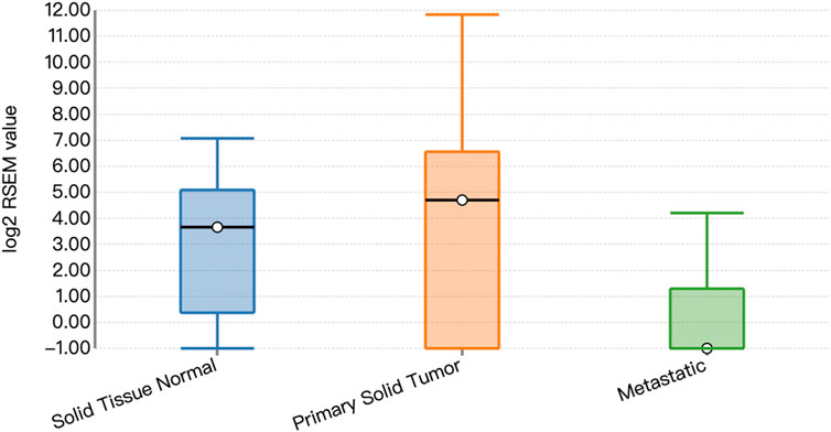 Functional prediction of our candidate SNPs in CancerSplicingQTL indicated that both rs285170 and rs405660 were associated with MYBL2 AS. The splice site was chr20:42310424, and both affected MYBL2 exon 3 skipping; that is, generation of a spliceosome with exon 3 skipping (Table 7). The expression landscape of MYBL2 splice isoforms in breast cancer was next analysed on the TSVdb platform. In this database, we performed an analysis of the exonic expression landscape of MYBL2 in breast cancer, with the final output shown in Figure 3. The figure illustrates the two splice isoforms of MYBL2 and the 14 exons on MYBL2 in normal, orthotopic, and metastatic breast cancer tissue, and the difference between the two splice isoforms is shown in Figure 3 as to whether exon 3 skipping occurs during the splicing process. The expression differences of the two splice isoforms between tissues are shown in Figures 4, 5. The expression of whole exon spliceosomes without AS was significantly higher in breast cancer than in normal tissues (Figure 4), while the expression of exon 3-skipped spliceosomes was not significantly different between breast cancer and normal tissues (Figure 5). This result suggests that the exon 3-skipped spliceosome does not increase breast cancer susceptibility and that this spliceosome reduces breast cancer susceptibility compared to whole exon spliceosome carriers.