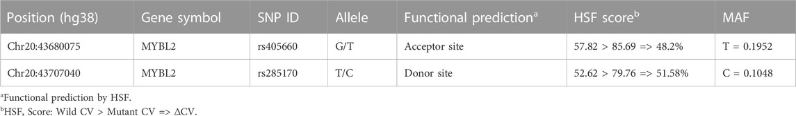 To further verify whether the above 199 SNPs have AS function, we employed HSF for AS function prediction. We used the Vannoportal database to query transcript IDs and HGV numbers corresponding to the 199 SNPs obtained in the first step and then predicted the data using HSF, which indicated that a total of 41 SNPs were likely to affect MYBL2 AS (Supplementary Table S3). To compare the strength of splicing activity at each locus, only SNP loci with HSF scores were included in this study. Of the 41 potentially AS functional sites, ten SNPs were predicted by HSF to affect splice donor or splice acceptor generation. Based on the scores given by the HSF predictions, we further filtered SNPs with wild-type CV values <60, mutant CV values >70, ΔCV >30%, and AS MAF >0.1, finally yielding a total of five SNPs. Combined with the results of the LD analysis, only two of the six linkage blocks contained SNPs that satisfied the filtering criteria, and two of the best scoring SNPs, rs285170 and rs405660, were finally screened out in each of these two linkage blocks, respectively (Table 1).