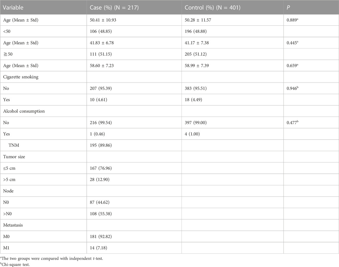 A total of 217 TNBC cases and 401 cancer-free controls were included in our case-control study, with a mean age of 50.41 years (±10.93 years) in the case group and 50.28 years (±11.57 years) in the control group. There was no significant difference in age (p = 0.889) between cases and controls. After stratification based on age, there was still no significant difference in age between cases and controls. There were also no significant differences in smoking and alcohol consumption between cases and controls. The TNM staging characteristics are described in Table 2.