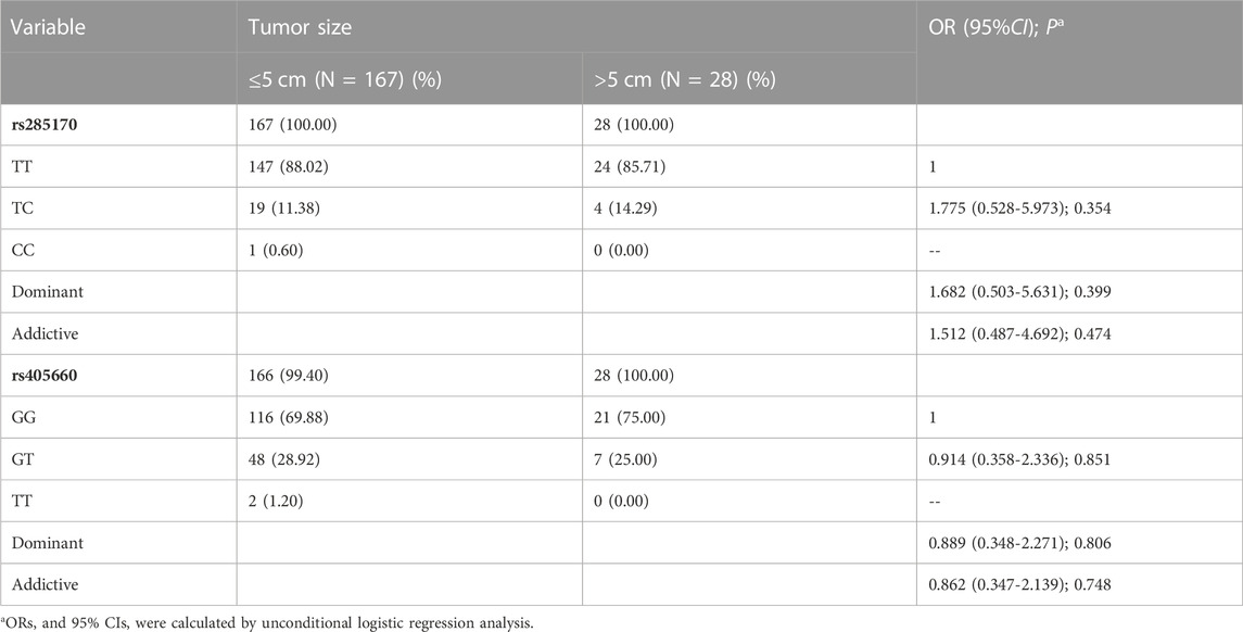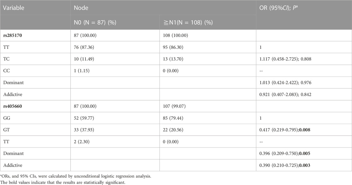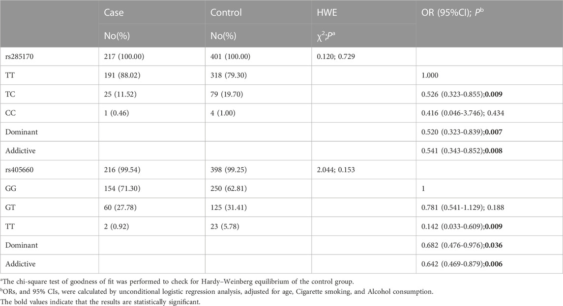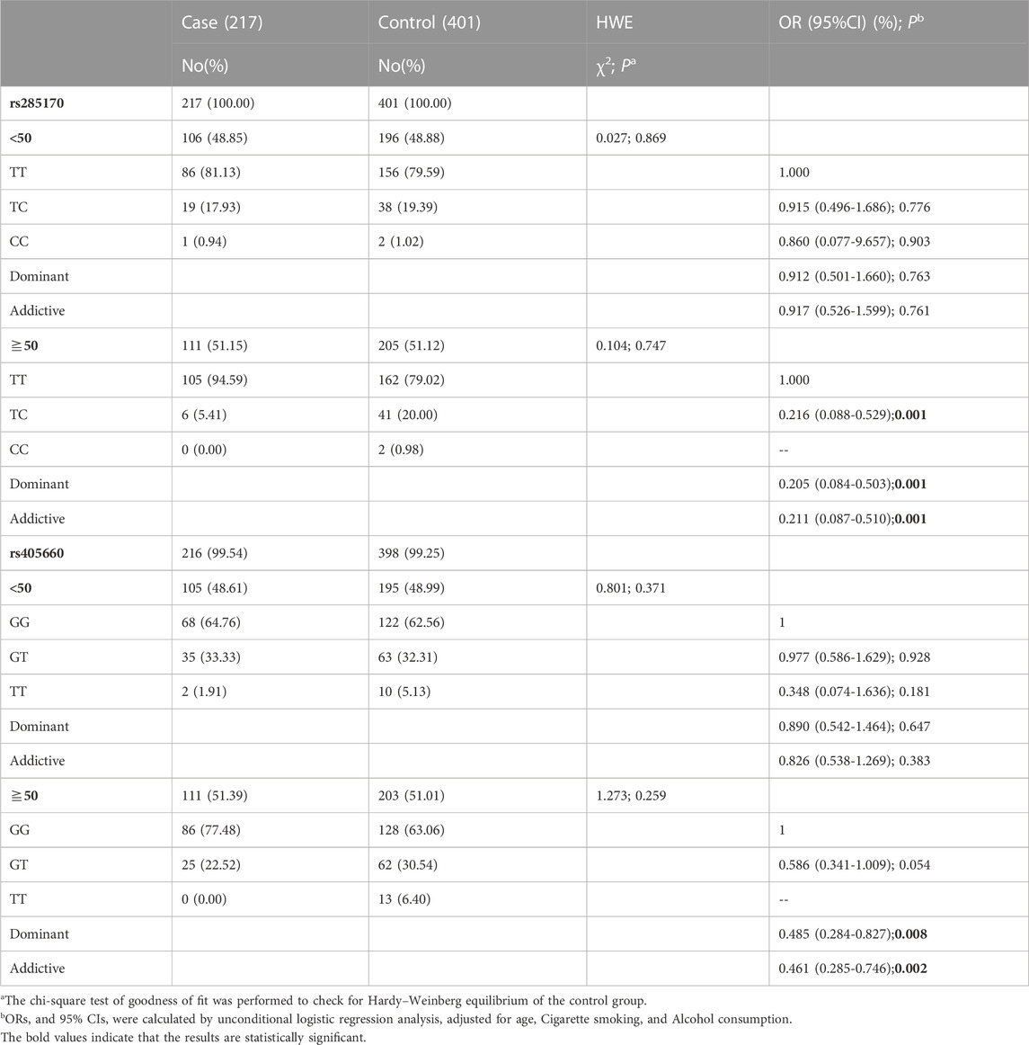 Typing experiments were performed in which 5% of the samples were randomly selected for repeated experiments with an anastomosis rate of 100%. The distribution of rs285170 typing results of cases and controls is shown in Table 3. The genotype distributions of both SNPs in the control group were in accordance with HWE.
