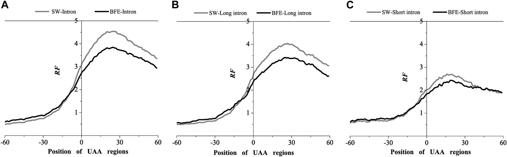 Comparations of Relative Frequency (RF) distributions between SW method and BFE method on UAA regions. (A) The total introns, (B) the long introns and (C) the short introns.