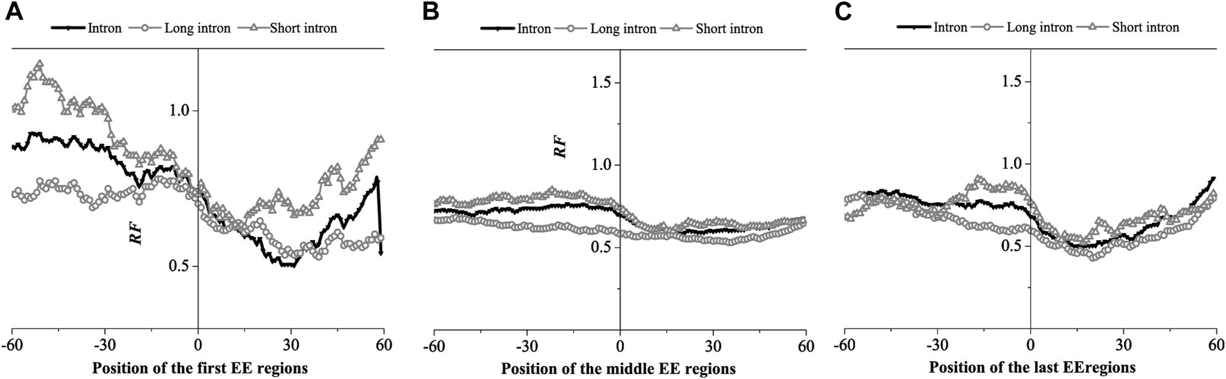 Relative Frequency (RF) distributions on the exon-exon junction (EE) regions of the mRNA. (A) The first EE regions, (B) the middle EE regions, (C) the last EE regions. The RF distributions related long introns and short introns are also presented in the figure.