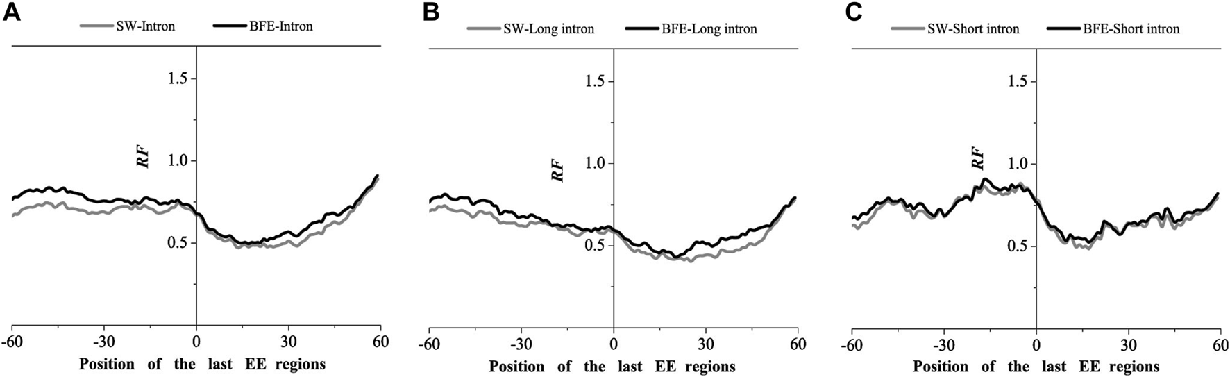Comparations of Relative Frequency (RF) distributions between SW method and BFE method on the last EE regions. (A) the total introns, (B) the long introns, (C) the short introns.