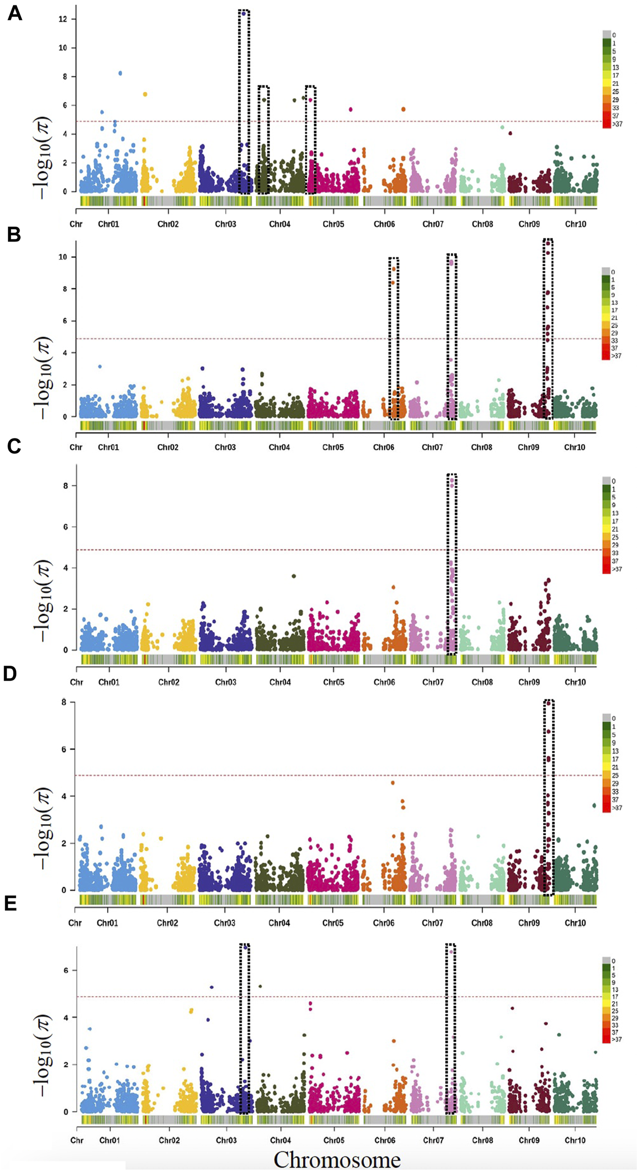 Manhattan plots based on rMVP-GWAS program using MBL population with highlighted genes or loci identified for various traits. Vertical dotted bars show genes and loci related to (A) days to anthesis (DTA: Chr3, Chr4 & Chr5); (B) Plant height or dwarfing genes (Dw1: Chr9, Dw2: Chr6, and Dw3: Chr7); (C) Grain yield and Dw3 (Chr7); (D) 1000-grain weight and Dw1 (Chr9); (E) Yield per plant and Dw3 (Chr3 and Chr7). The -log10 (p) values (y-axis) are plotted against the position on each chromosome (x-axis). Each solid circle represents a SNP, and the red dashed line represents the Bonferroni-corrected threshold (p ≤ 0.05).