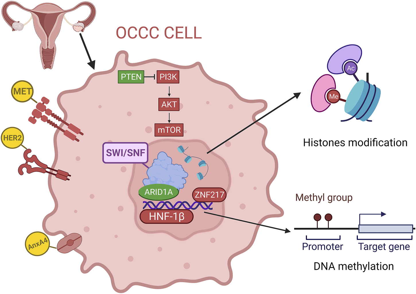 Histones bind to DNA to form chromatin in eukaryotes, and modification of histones, including methylation, acetylation, small ubiquitin-like modifications, phosphorylation, ubiquitination and so on, can regulate gene expression by histone modification enzymes, which play an important role in tumorigenesis (Esteller, 2007; Audia and Campbell, 2016). It was reported that ARID1A suppressed histone deacetylase 6 (HDAC6) in OCCC directly, and HDAC6 nuclear expression was associated with immuno- and hypoxia tolerance and cancer stem cell phenotype in OCCC and upregulated following chemotherapy, leading to a poor prognosis (Yano et al., 2018; Yano et al., 2019). Additionally, HDAC6 inhibition selectively was found to promote apoptosis of ARID1A-inactivated cells, suggesting the use of HDAC6 inhibition in the treatment of OCCC (Altucci, 2017). Expression of HDAC 1 and 7 was also identified with a poor prognosis in OCCC (Yano et al., 2018). Approximately half of OCCC had mutations in the SWI/SNF chromatin remodelling complex subunit ARID1A, and cross-cancer analysis of the TCGA database showed that lysine-specific histone demethylase 1 (LSD1), which regulated the chromatin landscape and gene expression by demethylating proteins such as histone H3, was highly expressed in SWI/SNF-mutated tumors. Furthermore, the reversible LSD1 inhibitor SP-2577 has the ability to promote antitumor immunity and T cell infiltration in OCCC cell lines (Soldi et al., 2020). Several studies have demonstrated synthetic lethality by targeting EZH2 (enhancer of Zeste homolog 2) histone methyltransferase activity in ARID1A-mutated OCCC (Bitler et al., 2015). The results of another study suggested that the histone methyltransferase SET and MYND domain containing 2 (SMYD2) could promote OCCC viability and inhibit SMYD2-induced apoptosis in OCCC cells (Kojima et al., 2020). Wolf-Hirschhorn syndrome candidate gene-1 (WHSC1), a histone methyltransferase, has also been found to be upregulated in OCCC, leading to cell growth induction (Kojima et al., 2019). At present, there are relatively few studies on histone modification in OCCC. As the research goes further, novel molecular targeted approaches for OCCC treatment may be represented.
