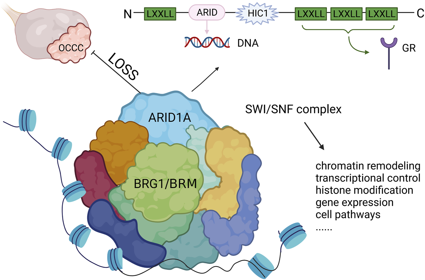 The structure of ARID1A and its role in OCCC. ARID1A mutation leads to the loss of expression and inhibits the function of SWI/SNF complex, which drives tumor malignancy. LXXLL, Leucine-x-x-leucine-leucine motif; ARID, AT-rich interactive domain; HIC1, hypermethylated in cancer 1 domain; GR, glucocorticoid receptor.