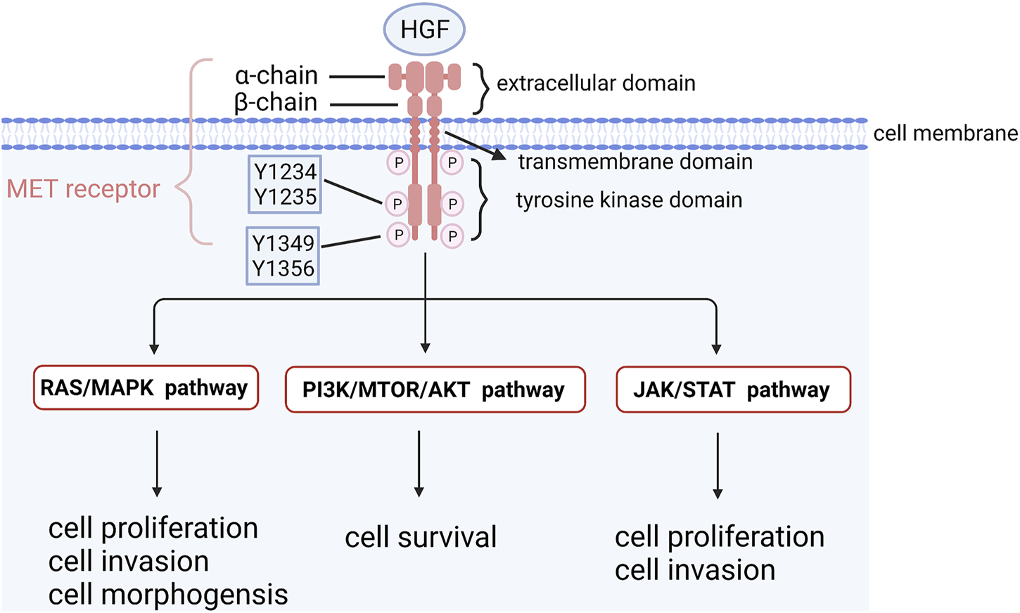 The structure of MET and its downstream signaling pathways. HGF binds to MET and regulates kinase activity by inducing homodimerization and phosphorylation of Y1234 and Y1235, two catalytic sites of tyrosine residues in MET receptor. Phosphorylated carboxyl terminal containing Y1349 and Y1356 serves as docking sites for intracellular protein kinases, transmits signals downstream and activates RAS-MAPK signaling pathway, PI3K/AKT/mTOR signaling pathway and other pathways to promote cell proliferation and survival.