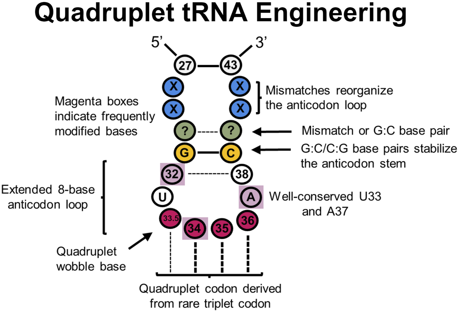 Figure 5. tRNA sites explored in quadruplet tRNAs to improve translational fidelity. Efficient quadruplet tRNAs have a well-conserved G:C/C:G base pair adjacent to the anticodon loop (yellow), A37 and U33 residues, and base pair mismatches near the beginning of the anticodon stem (blue) which adjusts the conformation of tRNAs. Frequently post-transcriptionally modified residues (purple boxes) also impact translational fidelity, although position 33.5 base pairing with a quadruplet codon is not necessary.