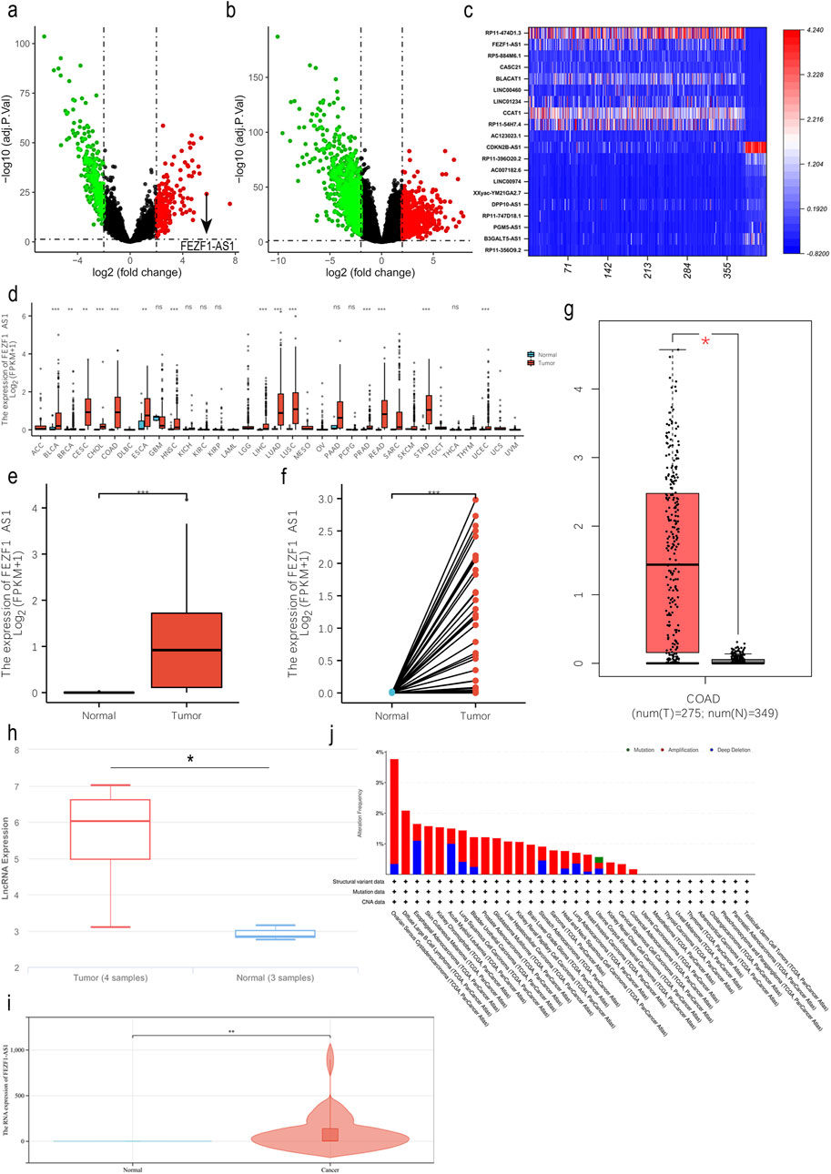 Figure 1. FEZF1-AS1 expression was upregulated in CC tissues. (a and b) The volcano maps of DElncRNAs and DEmRNAs in CC (|logFC| > 2, adj. P. Val <0.01) based on the TCGA dataset. Red represents the upregulated RNAs and green represents the downregulated RNAs. (c) In CC, heat map of DElncRNAs with expression levels in the top 10 and the bottom 10 based on the TCGA dataset. The X-axis represented 387 CC tissues and 38 normal colon tissues, and the Y-axis represents DElncRNAs. (d) In the TCGA database, the expression of FEZF1-AS1 in pan-cancer. (e and f) Expression of FEZF1-AS1 in unpaired or paired CC and normal colon tissues based on the TCGA dataset. (g and h) Expression of FEZF1-AS1 in CC and normal colon tissues based on GEPIA and lnCAR databases. (i) Expression of FEZF1-AS1 in 36 pairs of fresh CC and normal colon tissues. (j) In the cBioPortal database, FEZF1-AS1 showed an amplification mutation in CC. *, P < 0.05; **, P < 0.01; ***, P < 0.001; ns, no significance.