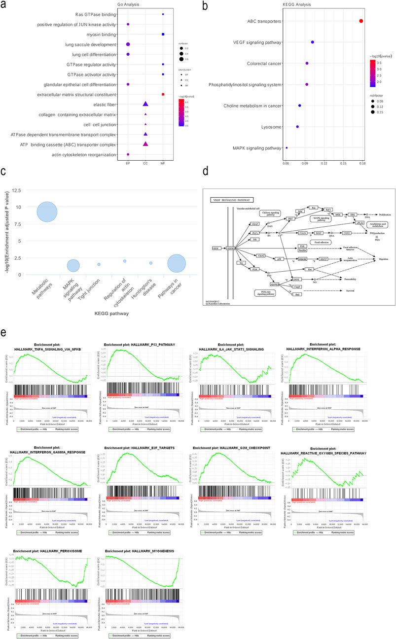 Figure 2. FEZF1-AS1 was enriched into several signaling pathways closely related to tumors, including the PI3K/AKT signaling pathway. (a and b) GO and KEGG functional enrichment analyses of FEZF1-AS1 and its co-expressed DEmRNAs based on the TCGA dataset. (c) KEGG functional enrichment analysis of FEZF1-AS1 in the lnCAR database. (d) VEGF activated the downstream PI3K/AKT signaling pathway in the KEGG database. (e) GSEA of FEZF1-AS1 and its co-expressed DEmRNAs based on the TCGA dataset.