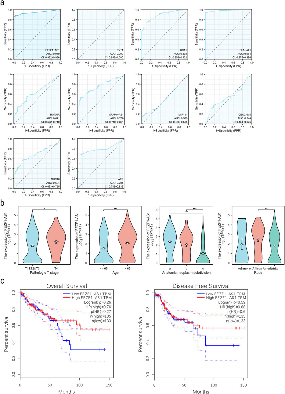 Figure 3. FEZF1-AS1 had a high diagnostic value for CC and was correlated with clinicopathological parameters of CC patients. (a) ROC curves of FEZF1-AS1, PVT1, UCA1, BLACAT1, HOTAIR, AFAP1-AS1, MIR141, CEACAM5 (CEA), MUC16 (CA-125), and AFP in CC based on the TCGA dataset. (b) Expression of FEZF1-AS1 in patients with CC at different T stages, ages, tumorigenic sites (a, right colon; b, transverse colon; c, left colon), and race based on the TCGA dataset. (c) Kaplan–Meier evaluation of OS and DFS of cases from the GEPIA database. *, P < 0.05; **, P < 0.01; ***, P < 0.001.