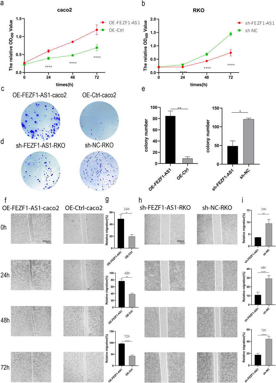 Figure 4. FEZF1-AS1 promoted the proliferation and migration of CC cells. (a and b) Growth curves of the cells at 24 h, 48 h, and 72 h were detected using the CCK8 assay. Red represents the OE-FEZF1-AS1-Caco2 or sh-FEZF1-AS1-RKO cell, and green represents the OE-Ctrl-Caco2 or sh-NC-RKO cell. (c and d) Colony formation of the cells at 14 days. Blue dots on the panel represent cell colonies. (e) Statistical analysis of colony formation. (f and h) The migration of cells at 0 h, 24 h, 48 h, and 72 h was detected using the scratch assay. (g and i) Statistical analysis of scratch assay. *, P < 0.05; **, P < 0.01; ****, P < 0.0001.