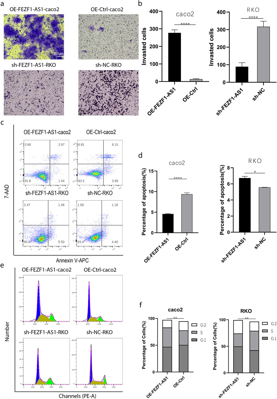 Figure 5. FEZF1-AS1 promoted the invasion, survival, and proliferation of CC cells. (a) The invasion of cells at 48 h was detected using the Transwell assay. (b) Statistical analysis of invasion. (c) The apoptosis of cells was detected through flow cytometry. (d) Statistical analysis of apoptosis. (e) Cell cycle was detected through flow cytometry. (f) Statistical analysis of cell cycle. *, P < 0.05; **, P < 0.01; ****, P < 0.0001.