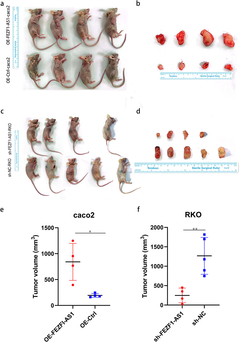 qRT-PCR was used to identify the expression of FEZF1-AS1 in CC cells. The results showed that compared with NCM460 cell, the expression of FEZF1-AS1 was relatively higher in Caco2 and RKO cells (Supplementary Figure S3A). Therefore, we selected RKO cell for lentivirus FEZF1-AS1-knocked down transfection and Caco2 cell for lentivirus FEZF1-AS1-overexpressed transfection, which were named sh-FEZF1-AS1-RKO and sh-NC-RKO cells, and OE-FEZF1-AS1-Caco2 and OE-Ctrl-Caco2 cells, respectively. Lentivirus fluorescence transfection efficiency reached 100% (Supplementary Figure S3B). Compared with the OE-Ctrl-Caco2 cell, the expression of FEZF1-AS1 in the OE-FEZF1-AS1-Caco2 cell was notably increased, and the overexpressed efficiency could reach 2,600 times (Supplementary Figure S3C); the proliferation, migration, invasion, and cycle (S-phase cell proportion) of the OE-FEZF1-AS1-Caco2 cell were significantly increased, and apoptosis was significantly decreased (Figures 4, 5). Compared with that in the sh-NC-RKO cell, the expression of FEZF1-AS1 in the sh-FEZF1-AS1-RKO cell was decreased significantly, and the knocked down efficiency reached 85% (Supplementary Figure S3D); the proliferation, migration, invasion, and cycle (S-phase ratio) of sh-FEZF1-AS1-RKO were significantly reduced, and apoptosis was significantly increased (Figures 4, 5). The results of the tumor-bearing mouse experiment showed that the volumes of tumor formation in nude mice implanted with Caco2 cells overexpressing FEZF1-AS1 were significantly larger than those in control mice (Figures 6a,b). The volumes of tumor formation in nude mice implanted with RKO cells knocking down FEZF1-AS1 were significantly smaller than those in control mice (Figures 6c,d). All abovementioned results validated that FEZF1-AS1 facilitates the progression of CC.