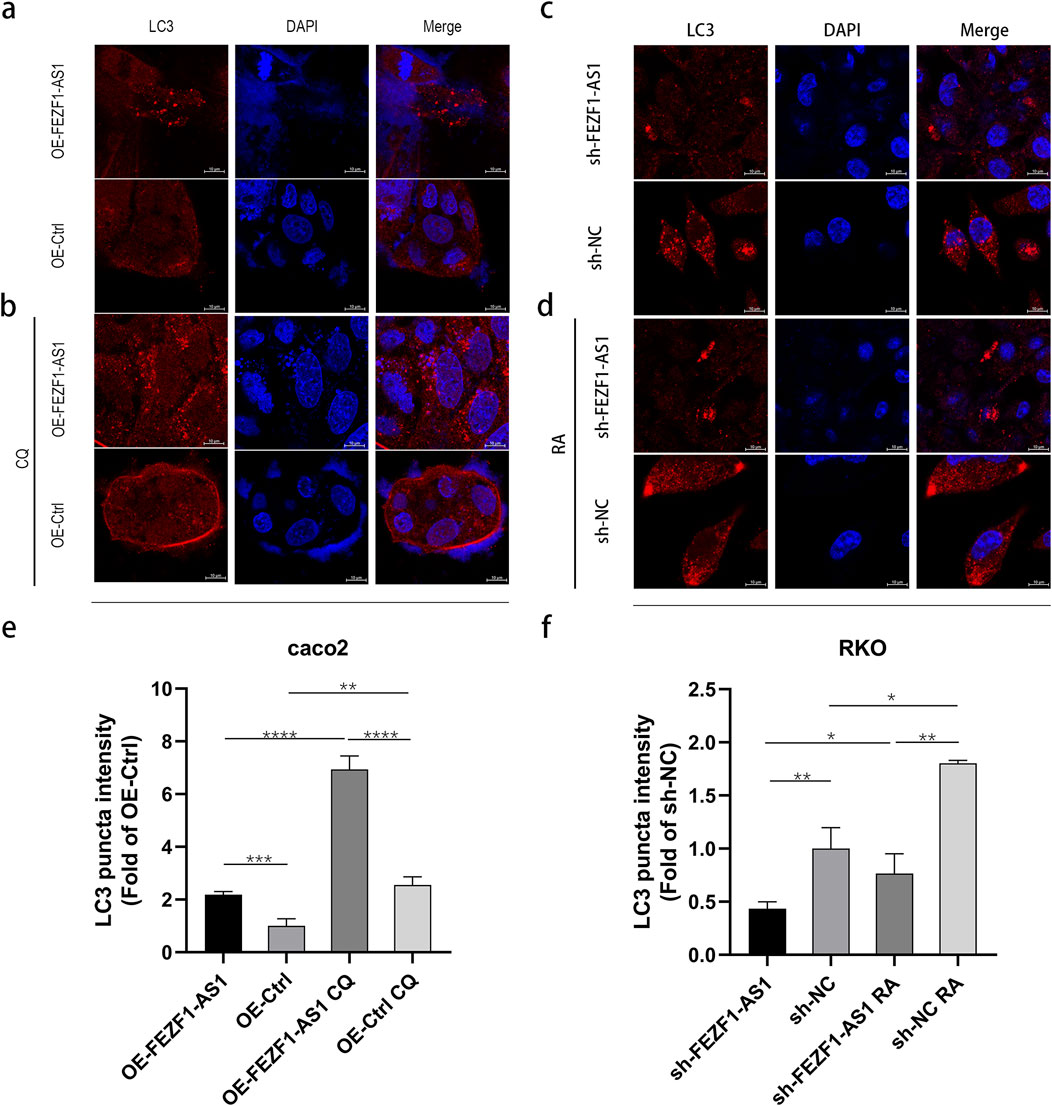 Figure 7. FEZF1-AS1 triggered autophagy in Caco2 and RKO cells. (a and b) LC3 expression in OE-FEZF1-AS1-Caco2 and OE-Ctrl-Caco2 cells with or without 300 μmol/L CQ for 12 h was detected using the IF assay. Brightest red dot clusters in the image represent the LC3 proteins. (c and d) LC3 expression in sh-FEZF1-AS1-RKO and sh-NC-RKO cells with or without 0.62 nmol/L RA for 5 h was detected using the IF assay. Brightest red dot clusters in the image represent the LC3 proteins. (e and f) Statistical analysis of LC3 expression. *, P < 0.05; **, P < 0.01; ***, P < 0.001; ****, P < 0.0001.