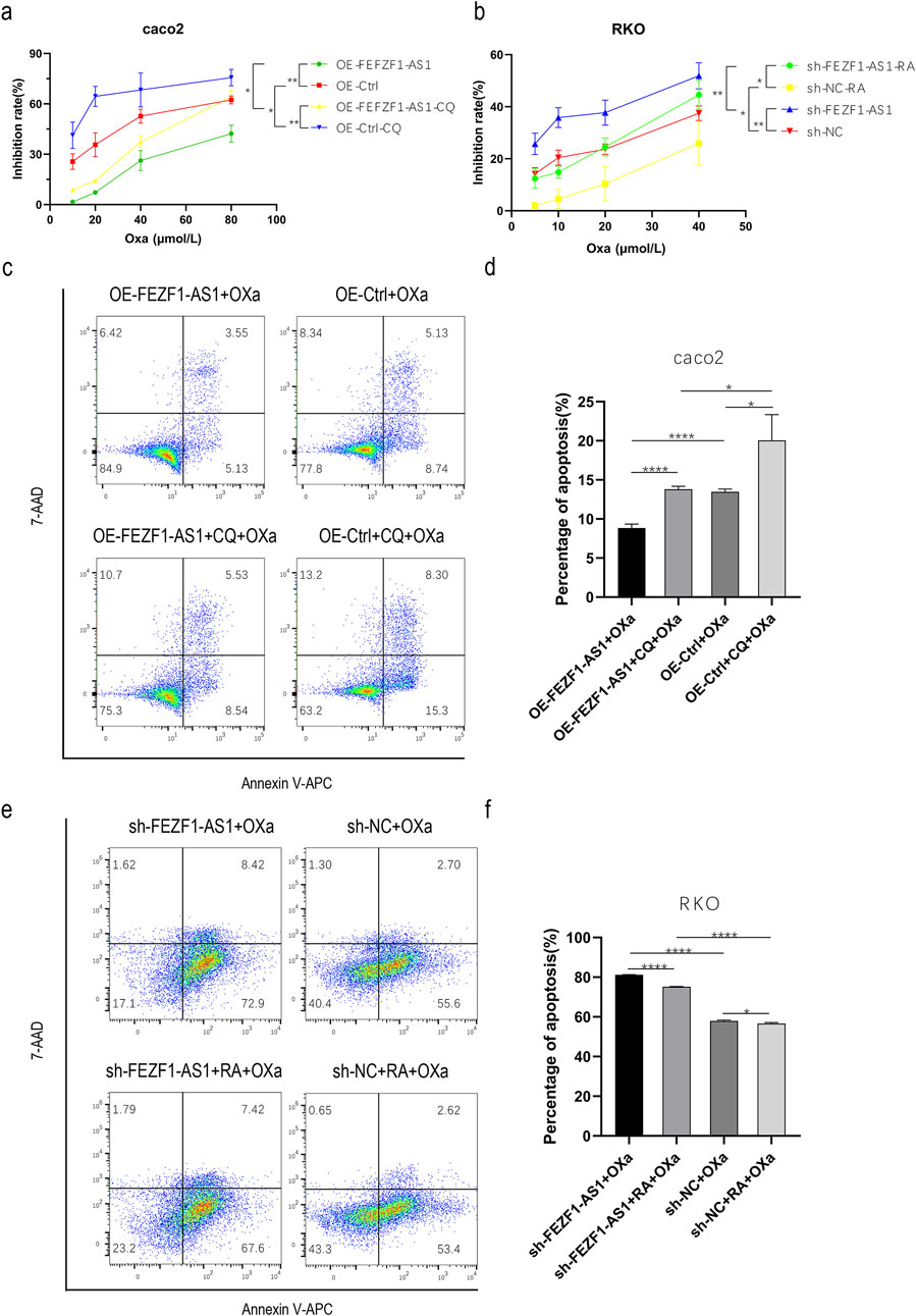 Figure 8. FEZF1-AS1 promoted the progression of CC and reduced the sensitivity to Oxa through autophagy. (a) Growth inhibition curves of cells, regardless of whether Oxa was mixed with CQ or not. (b) Growth inhibition curves of cells with treatments of Oxa combined with RA or without it. (c) Apoptosis of cells, regardless of whether Oxa was mixed with CQ or not. (d) Statistical analysis of apoptosis. (e) Apoptosis of cells with treatments of Oxa combined with RA or without it. (f) Analysis of apoptosis statistics. *, P < 0.05; **, P < 0.01; ****, P < 0.0001.