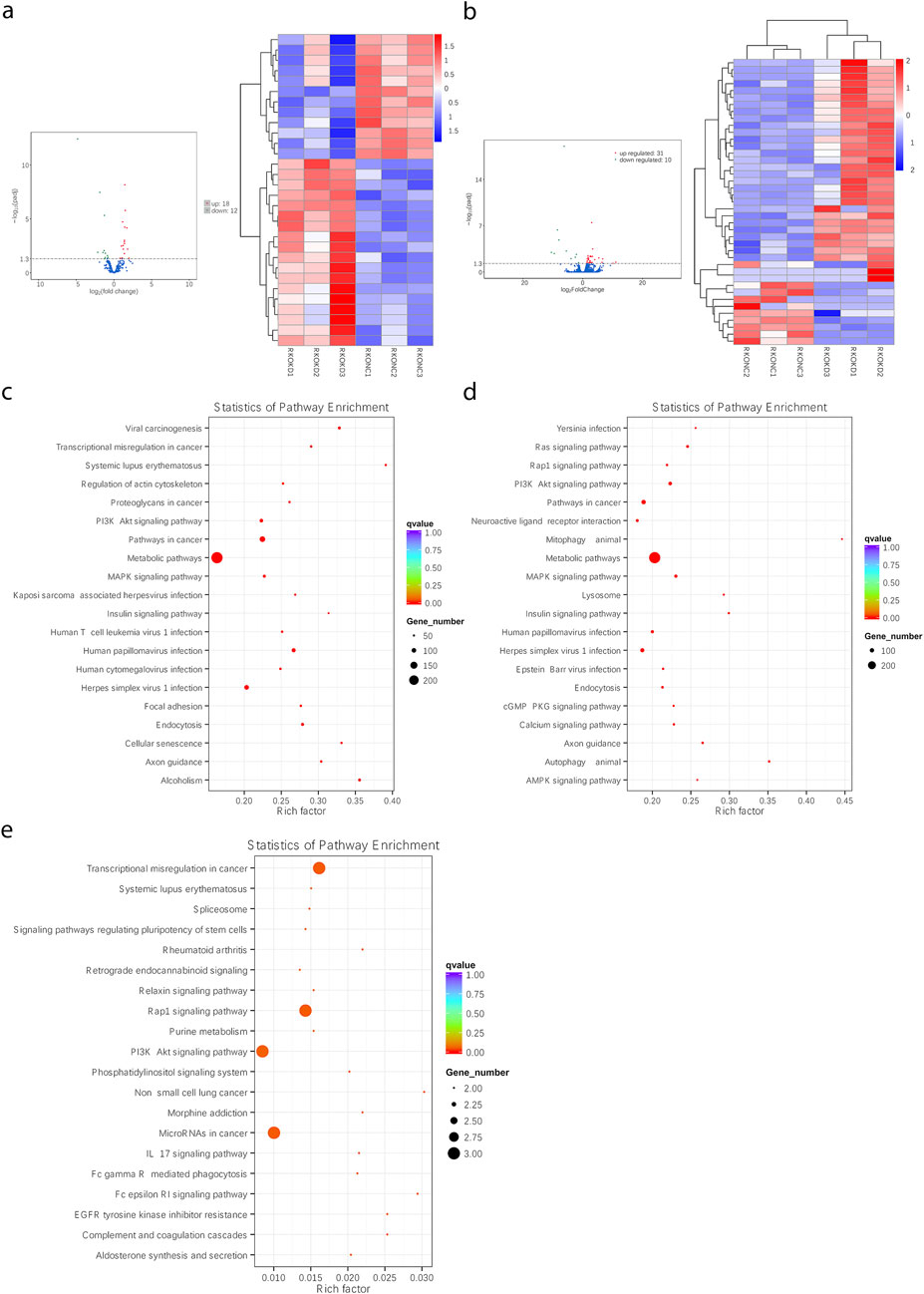 Figure 9. Through RNA-seq, FEZF1-AS1 could facilitate CC development through the modulation of the PI3K/AKT signaling pathway, facilitating autophagy. (a and b) The heat maps of DEmiRNAs and DEmRNAs between sh-FEZF1-AS1-RKO cells and sh-NC-RKO cells. (c) KEGG functional enrichment analysis of FEZF1-AS1 and its co-expressed gene set in sh-FEZF1-AS1-RKO and sh-NC-RKO cells. (d) KEGG functional enrichment analysis of the DEmiRNA and its co-expressed gene set in sh-FEZF1-AS1-RKO and sh-NC-RKO cells. (e) KEGG functional enrichment analysis of the DEmRNA and its co-expressed gene set in sh-FEZF1-AS1-RKO and sh-NC-RKO cells.
