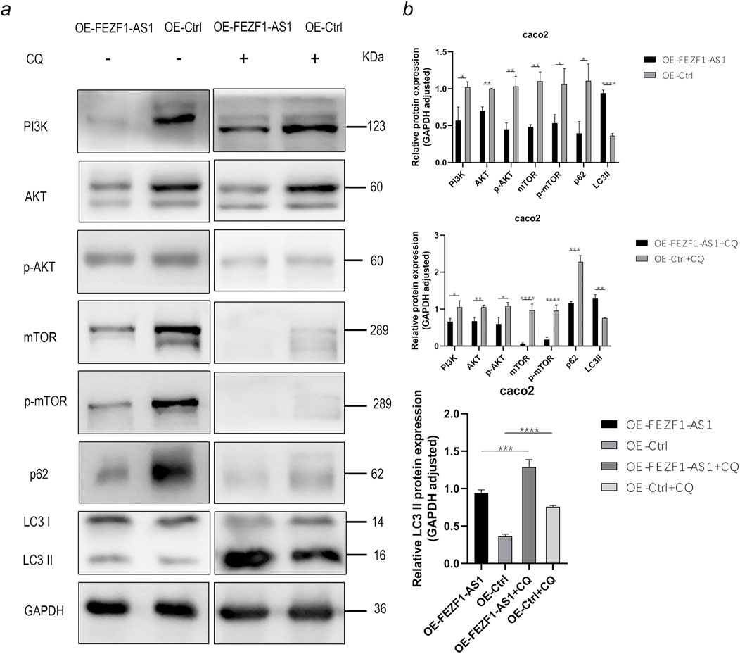Figure 10. FEZF1-AS1 inhibited the PI3K/AKT/mTOR signaling pathway, thereby triggering autophagy and facilitating Caco2 development. (a) WB analysis of the PI3K/AKT/mTOR signaling pathway and autophagy marker proteins in OE-FEZF1-AS1-Caco2 and OE-Ctrl-Caco2 cells with or without CQ treatment. GAPDH served as an internal loading control. (b) Statistical analysis of the protein expressions. *, P < 0.05; **, P < 0.01; ***, P < 0.001; ****, P < 0.0001.