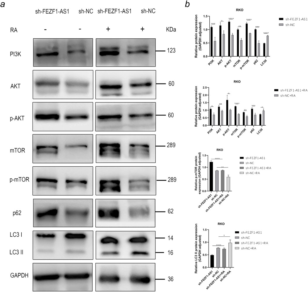 Figure 11. FEZF1-AS1 inhibited the PI3K/AKT/mTOR signaling pathway, thereby triggering autophagy and facilitating RKO development. (a) WB analysis of the PI3K/AKT/mTOR signaling pathway and autophagy marker proteins in sh-FEZF1-AS1-RKO and sh-NC-RKO cells with or without RA treatment. GAPDH served as an internal loading control. (b) Statistical analysis of the protein expressions. *, P < 0.05;**, P < 0.01; ***, P < 0.001; ****, P < 0.0001.