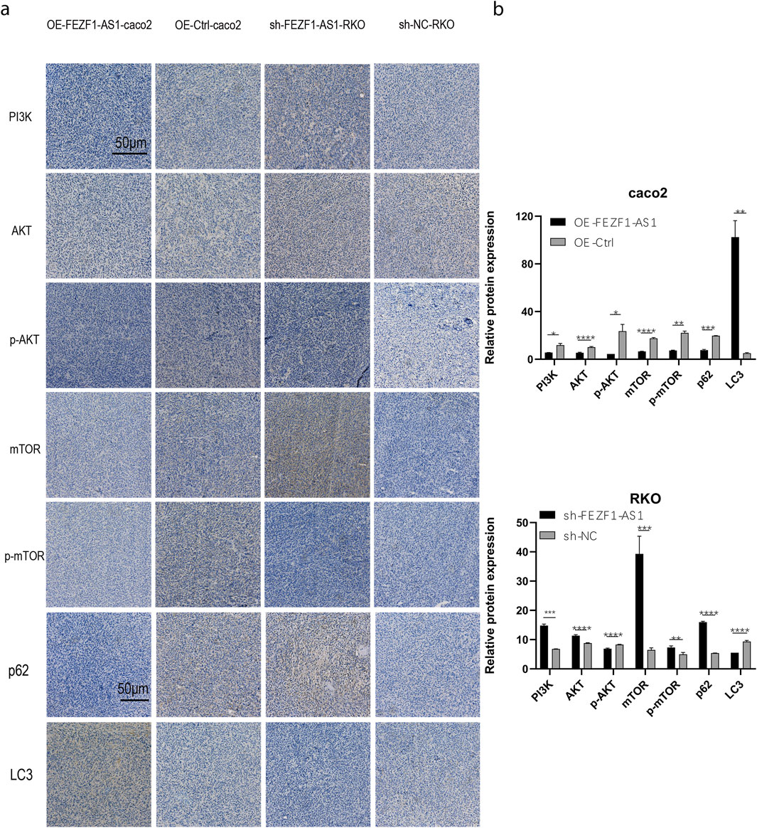 Figure 12. FEZF1-AS1 inhibited the PI3K/AKT/mTOR signaling pathway, thereby triggering autophagy and facilitating CC development. (a) IHC staining of key proteins of the PI3K/AKT/mTOR pathway and autophagy marker proteins in tumor-forming tissues of nude mice. Blue stain represents the nucleus and yellow stain represents the target protein. (b) Statistical analysis of the protein expressions. *, P < 0.05; **, P < 0.01; ***, P < 0.001; ****, P < 0.0001.