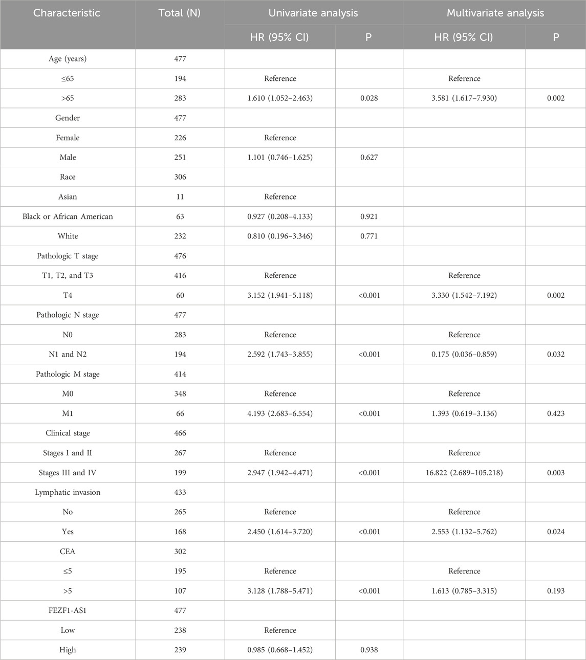 In the TCGA database (2023), COX regression was used to analyze CC-related risk factors. The effect of FEZF1-AS1 on the survival of CC patients was analyzed in the GEPIA database. The mean expression of FEZF1-AS1 in CC patients was set as the cutoff value. The Mann–Whitney U test and Kruskal–Wallis test were used to examine the relationship between the clinicopathological parameters of CC patients and FEZF1-AS1.