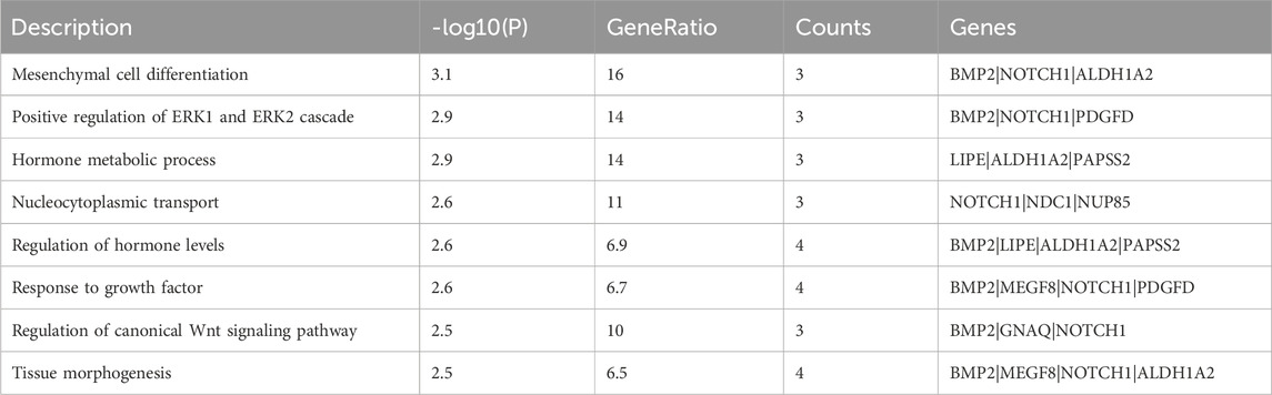 Furthermore, through Gene Ontology (GO) enrichment analysis of 32 differentially expressed genes, a total of 8 significantly enriched biological processes were identified (Figure 5; Table 1). These signaling pathways can be divided into three distinct functions: (1) Mesenchymal Cell Differentiation the Cellular Foundation of Fat Accumulation. The “mesenchymal cell differentiation” process, featuring key genes BMP2, NOTCH1, and ALDH1A2, emerges as a central driver of tail lipid deposition. Single-cell atlas analysis reveals that mesenchymal stem cells in the tail tissues of fat-tailed sheep exhibit a biased differentiation trajectory toward adipocytes, with BMP2 acting as a critical switch to initiate adipogenic commitment. Notably, the laminin-mediated signaling pathway, highly expressed in Guangling large-tailed sheep and Hu sheep, reinforces this differentiation process by stabilizing the extracellular matrix (ECM) microenvironment, facilitating the transition of mesenchymal cells into mature adipocytes (Wang et al., 2025). This aligns with the observation that breeds with robust tail fat deposition show enhanced activity in mesenchymal cell lineage specification, highlighting the cellular origin of phenotypic differences; (2) Hormone Metabolic Networks systemic Regulators of Lipid Balance. Enriched GO terms related to “hormone metabolic processes” and “hormone level regulation” (encompassing BMP2, MEGF8, NOTCH1, and PDGFD) underscore the systemic regulation of tail fat deposition. These genes form a hormone-sensing network: PDGFD modulates insulin sensitivity in adipocytes, while BMP2 interacts with thyroid hormone signaling to adjust lipid synthesis rates (Han et al., 2021). By fine-tuning hormone metabolism, this cluster indirectly coordinates energy allocation between tail fat storage and other physiological demands, ensuring adaptive responses to nutritional fluctuations—a mechanism particularly vital for sheep in resource-scarce arid regions; (3) Tissue Morphogenesis. Shaping the Structural Framework of Fat Depots. The enrichment of “tissue morphogenesis” terms reflects the structural remodeling required for large-scale fat accumulation. Single-cell analysis reveals that adipocytes in fat-tailed sheep secrete specific extracellular matrix (ECM) components, such as collagen subtypes, under the regulation of morphogenesis-related genes, shaping the architecture of tail adipose tissue. This structural adaptation allows for expanded lipid storage capacity, with distinct tissue morphologies (e.g., compact vs. diffuse fat distribution) corresponding to different tail shapes. The cell communication network, mediated by growth factor signals, coordinates this morphogenetic process, ensuring the synchronized expansion of fat depots and supporting the development of vasculature (Wang et al., 2025). Collectively, these findings underscore that a complex multi-gene network regulates sheep tail lipid deposition. While the functions of core genes such as PDGFD, BMP2, and TBX15 have been partially elucidated, the roles of other candidates (e.g., GLIS1 and MSRB3) remain to be characterized through functional assays, including gene knockout/overexpression studies and downstream pathway analyses. These results not only enhance our understanding of the genetic basis of fat-tailed phenotypes but also provide a theoretical framework for molecular breeding strategies that aim to tailor sheep traits to diverse agricultural and environmental needs (Wang et al., 2025).