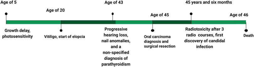 Anamnesis revealed that the patient had been diagnosed with growth delay since childhood. Patches of vitiligo appeared at the age of 20 years, and progressive hearing loss was noted in the 2 years preceding the observation (Figure 1). Strangely, oral Candida infection was observed in the 5 months preceding the genetic inquiry.