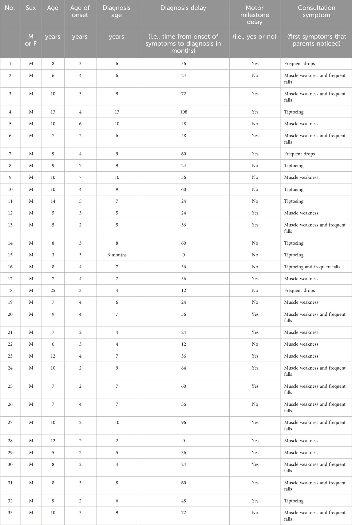 Thirty-seven cases with clinically suspected DMD were detected and referred from different health institutions participating in the study. Four cases had negative genetic test results and were therefore excluded. This left 33 genetically confirmed cases with DMD that are part of this analysis. Again, it is confirmed that all genetically positive cases were male as DMD is an X-linked disease.
