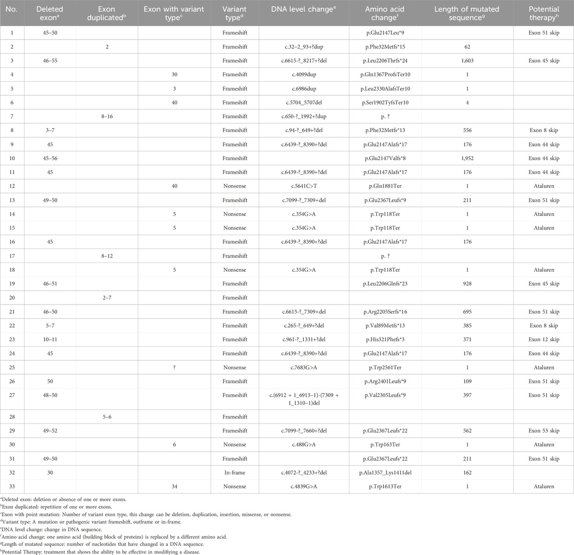 Two frameshift variants that have not been previously reported in CLINVAR and LOVD were detected (Leiden Open Variation Database) (National Library of Medicine, 2025). One was a deletion from exon 3 to 7 (NM_004006.2 c.94-?_649+?del; p.Phe32Metfs*13) with the DMD phenotype, even with ambulation at 10 years of age. Another was a single-nucleotide variant in exon 30 that generates a stop codon (NM_004006.3 c.4099dup) and makes a change in the p.Gln1367ProfsTer10 protein, with a severe DMD phenotype and loss of ambulation at 9 years of age.