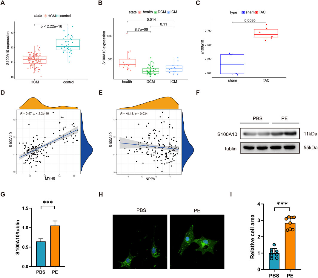 Taken together, these results not only establish a reliable in vitro model of PE-induced cardiomyocyte hypertrophy characterized by S100A10 upregulation., but also highlight the differential regulation of S100A10 across distinct cardiomyopathy subtypes, suggesting potential subtype-specific roles in disease pathogenesis.