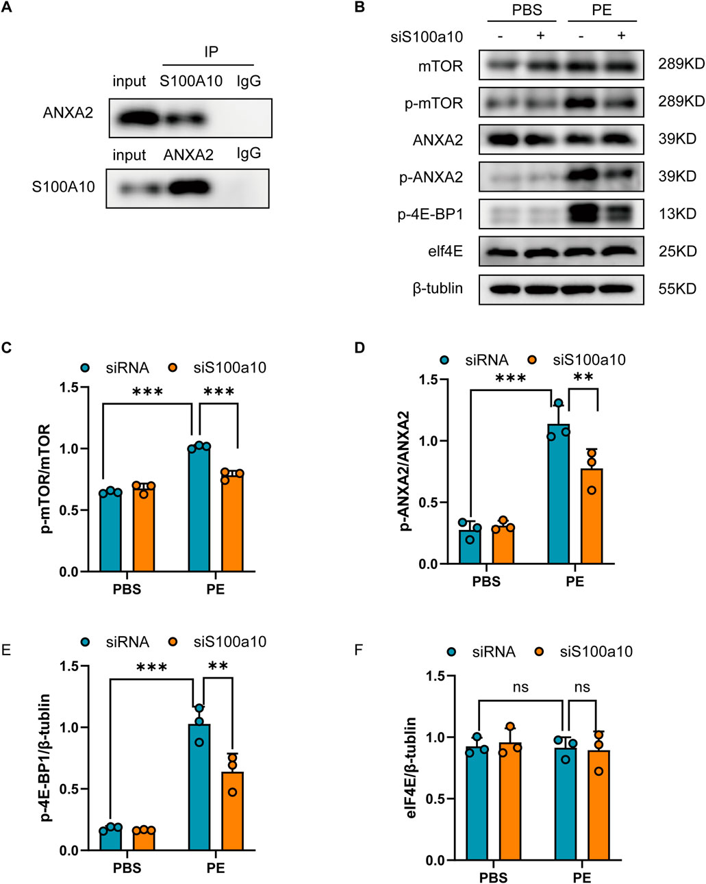 Western blot and bar graph analysis of protein interactions and expressions. Panel A shows immunoprecipitation results for ANXA2 and S100A10. Panel B displays Western blot bands for proteins such as mTOR, ANXA2, and others, with molecular weights indicated. Panels C to F present bar graphs comparing protein levels under different conditions (PBS, PE) with siRNA or siS100a10 treatments, showing significant differences denoted by asterisks.