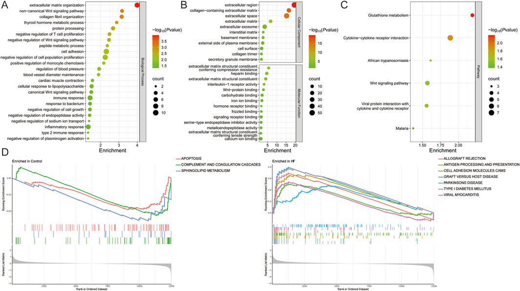 Figure 2. Functional enrichment analysis of DEGs in HF. (A,B) The (A) biological process, (B) cellular component, molecular function, (C) pathway, and (D) GESA for all sample DEGs.
