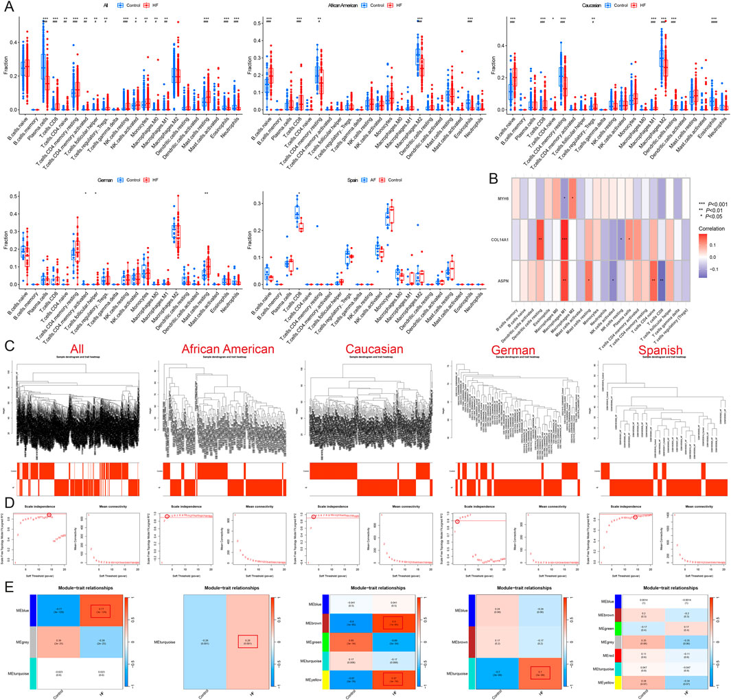 Figure 3. Identification of module genes and immune infiltration analysis in different populations. (A) Immune infiltration analysis of all, African American, Caucasian, German, and Spanish samples. (B) Correlation analysis of MYH6, ASPN, and COL14A1 with immune cells. (C) Sample clustering plot after removal of outlier samples. (D) Selection of soft thresholds. (E) Gene module of the most relevant genes to HF traits. *P < 0.05, **P < 0.01, ***P < 0.001.