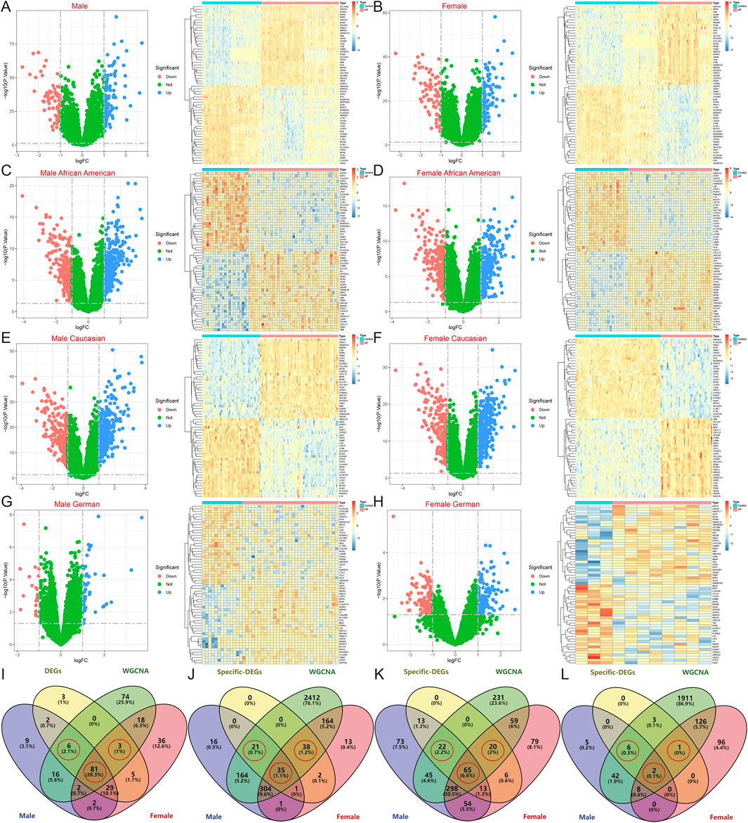 Figure 4. Identification of DEGs after gender stratification in different populations. (A–H) Volcano map and heatmap for differential expression analyses of (A) all males, (B) all females, (C) African American males, (D) African American females, (E) Caucasian males, (F) Caucasian females, (G) German males, and (H) German females. (I–L) The Venn diagram shows gender-specific DEGs of (I) all samples, (J) African Americans, (K) Caucasians, and (L) Germans.