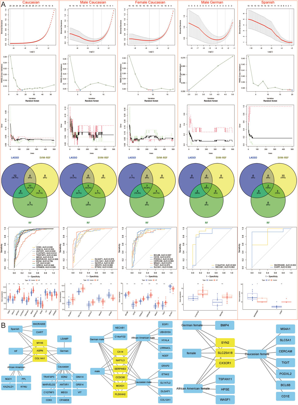 Figure 6. Machine learning models to screen candidate Hub genes. (A) LASSO, SVM-REF, and RF Screening for Candidate Hub Genes in Caucasian, Caucasian male, Caucasian female, German male, and Spanish samples. (B) Network diagram shows candidate Hub genes.