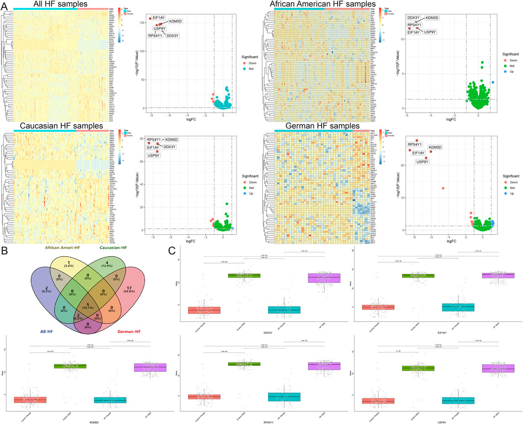 Figure 9. Identification of DEGs between males and females in a heart failure population from different regions. (A) Volcano map and heatmap for differential expression analyses of all, African American, Caucasian, and German samples. (B) The Venn diagram shows 5 common DEGs. (C) Single gene differential analysis between multiple groups of common DEGs.