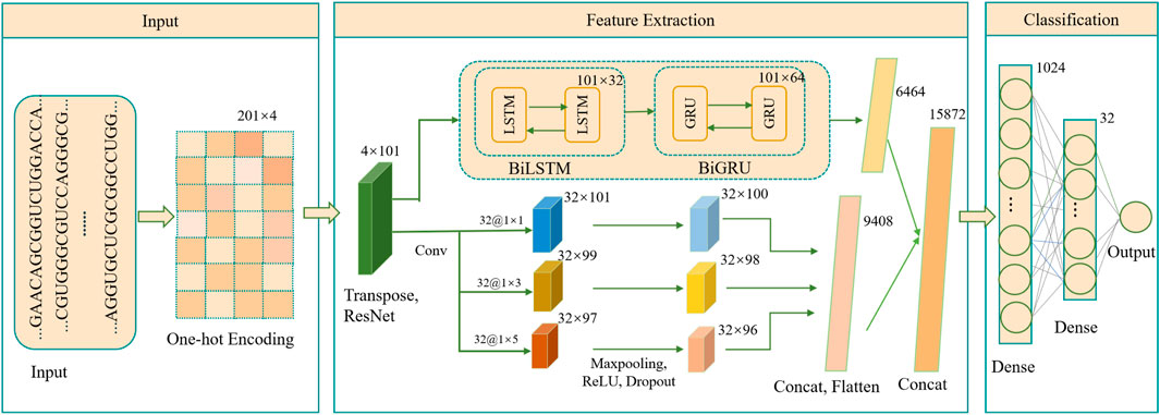 As illustrated in Figure 1, the DeepRNAac4C framework is designed with three key stages: input, feature extraction, and classification. The input stage begins with mapping RNA sequences, each of 201 nucleotides in length, into binary vectors using the one-hot encoding technique. This encoding captures the intricate details of the nucleotide sequences, serving as a robust foundation for the subsequent analysis.