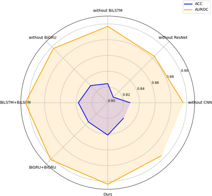 We sequentially compare the performance of models with and without ResNet, BiLSTM, BiGRU, and CNN modules. As shown in Figure 3, the model without the ResNet module exhibited a significant decline in ACC and AUROC, demonstrating its essential contribution to model performance. Accordingly, we retained the ResNet module in the finalized architecture to ensure optimal results. Subsequently, we assessed the impact of the CNN module. The inclusion of CNN led to improvements in ACC and AUROC, reaching 0.8411 and 0.9036, respectively—representing gains of 0.0130 and 0.0202 over the model without CNN.