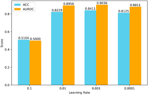 Secondly, we adjusted the learning rate, a critical hyperparameter, as shown in Figure 5. We tried various values for the learning rate, including 0.1, 0.01, 0.001, and 0.0001. According to the experimental results, the model performs best when the learning rate is set to 0.001.
