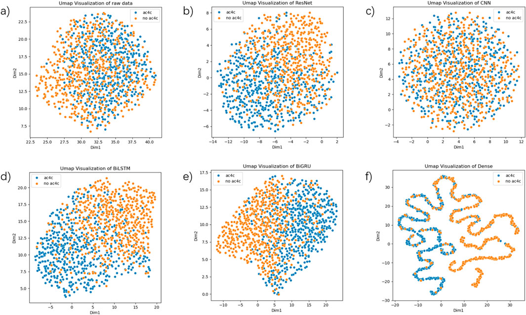 As shown in Figure 6, the UMAP plots for different stages of training demonstrate the model’s ability to progressively capture and separate the positive (ac4C) and negative (non-ac4C) samples. In the early stages of training (Figure 6a), the raw data is scattered without clear clustering, indicating that the model is still learning basic features. As the model advances through layers (Figures 6b–e), the feature space becomes more structured, and we see clearer clusters forming (Figures 6b-f). This reflects the model’s ability to learn higher-level, more discriminative features, which aids in distinguishing between ac4C sites and non-ac4C sites. Compared to other methods, the progressive improvement in clustering and sample separation in our model demonstrates the superior discriminative power of our approach. This can be particularly attributed to the hybrid architecture of DeepRNAac4C, which combines multi-scale CNNs and sequential models (BiLSTM + BiGRU). These architectures allow our model to capture both local sequence features and long-range dependencies, providing more informative and distinguishable features than traditional models.