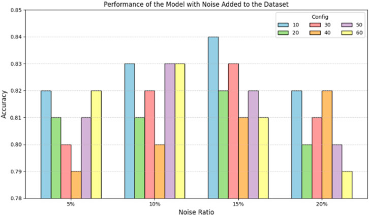 Figure 7 shows the model’s performance after adding noise to the dataset. The horizontal axis represents the number of consecutive base mutations, and the vertical axis represents the model’s prediction accuracy. The different colored bars indicate sequences with varying mutation rates (5%, 10%, 15%, 20%). From Figure 7, it can be observed that after adding noise to the dataset, the model’s prediction accuracy fluctuates between 0.79 and 0.84. Initially, the accuracy decreases slightly with the addition of noise but remains within an acceptable range. This indicates that the model possesses a degree of robustness and can maintain high accuracy even in noisy environments. In addition, the number of consecutive base mutations shows a different trend in terms of their effect on performance. As the number of consecutive base mutations increases, the prediction accuracy of each mutation rate changes differently. For example, when the number of consecutive base mutations is 50–60, the overall performance slightly decreases, but the overall accuracy remains above 0.79.