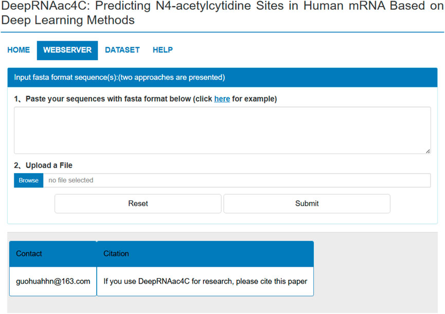 To facilitate researchers in using the DeepRNAac4C tool more conveniently, we have developed and launched a user-friendly web server, as shown in Figure 8. The DeepRNAac4C server features an intuitive interface and straightforward operation. The following is a brief overview of the usage steps: