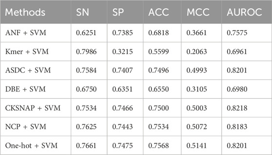 In terms of sensitivity and specificity, One-hot + SVM demonstrates balanced performance (SN: 0.7661, SP: 0.7475), surpassing methods like Kmer + SVM, which achieves the highest sensitivity (SN: 0.7986) at the cost of extremely low specificity (SP: 0.3215). Additionally, while CKSNAP + SVM achieves the highest AUROC (0.8218), indicative of strong discriminative power, One-hot + SVM and ASDC + SVM follow closely with AUROC scores of 0.8201. These results highlight the consistent and reliable performance of One-hot encoding across all key metrics.