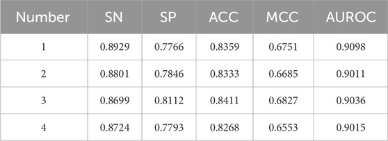 In this study, we use sensitivity (SN), specificity (SP), accuracy (ACC), and Matthews correlation coefficient (MCC) as evaluation metrics (He et al., 2024; Liu et al., 2024), which are defined as Equations 7-10.