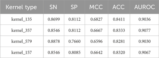 The results from our evaluation indicate that the model employing kernel_135 achieved the highest performance metrics, with a MCC of 0.6827 and an ACC of 0.8411. Notably, these scores surpassed those of the next best-performing models by margins of 0.016 for MCC and 0.0078 for ACC, highlighting the effectiveness of this particular kernel size.
