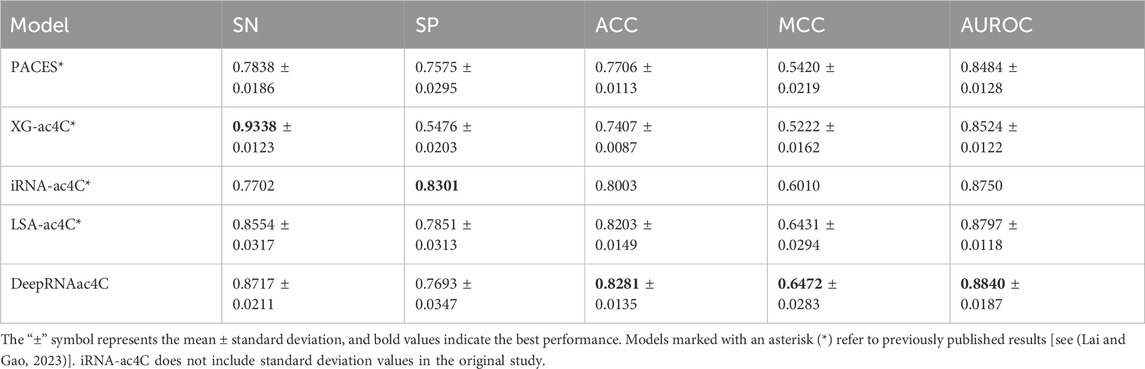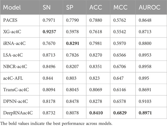 To further validate the proposed DeepRNAac4C, we compared it with existing methods of ac4C site prediction in human mRNA, including PACES (Zhao et al., 2019), XG-ac4C (Alam et al., 2020), iRNA-ac4C (Su et al., 2023), LSA-ac4C (Lai and Gao, 2023), NBCR-ac4C (He et al., 2024), TransC-ac4C (Liu et al., 2024), DPNN-ac4C (Yuan et al., 2024), and ac4C-AFL (Pham NT. et al., 2024). We conducted 10-fold cross-validation and independent testing in our experiments.